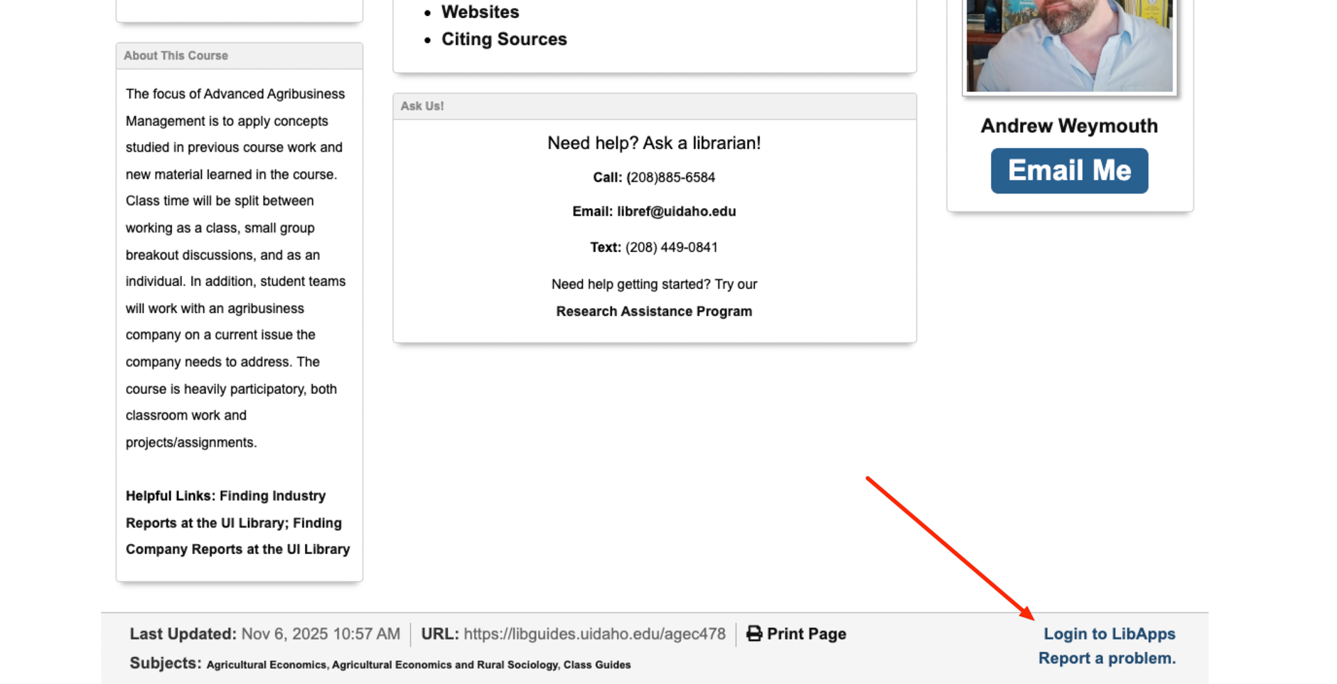 Login to LibApps.![Screen capture of the LibGuide interface with a red arrow pointing toward the bottom right of the screen.]()