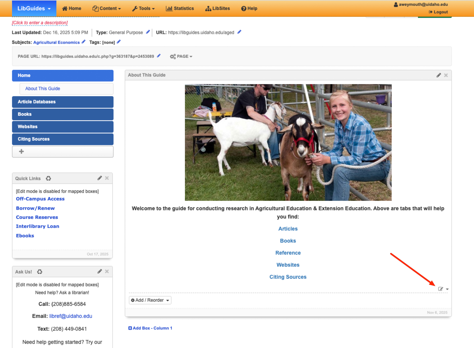 To begin, visit the LibGuide you want to remediate, scroll to the bottom of the page and select