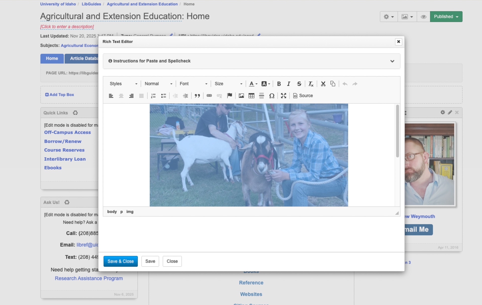 To add or edit the alt text of the images in your LibGuides, select the edit icon in the lower right corner of the box where the image is located, then select Edit from the dropdown: