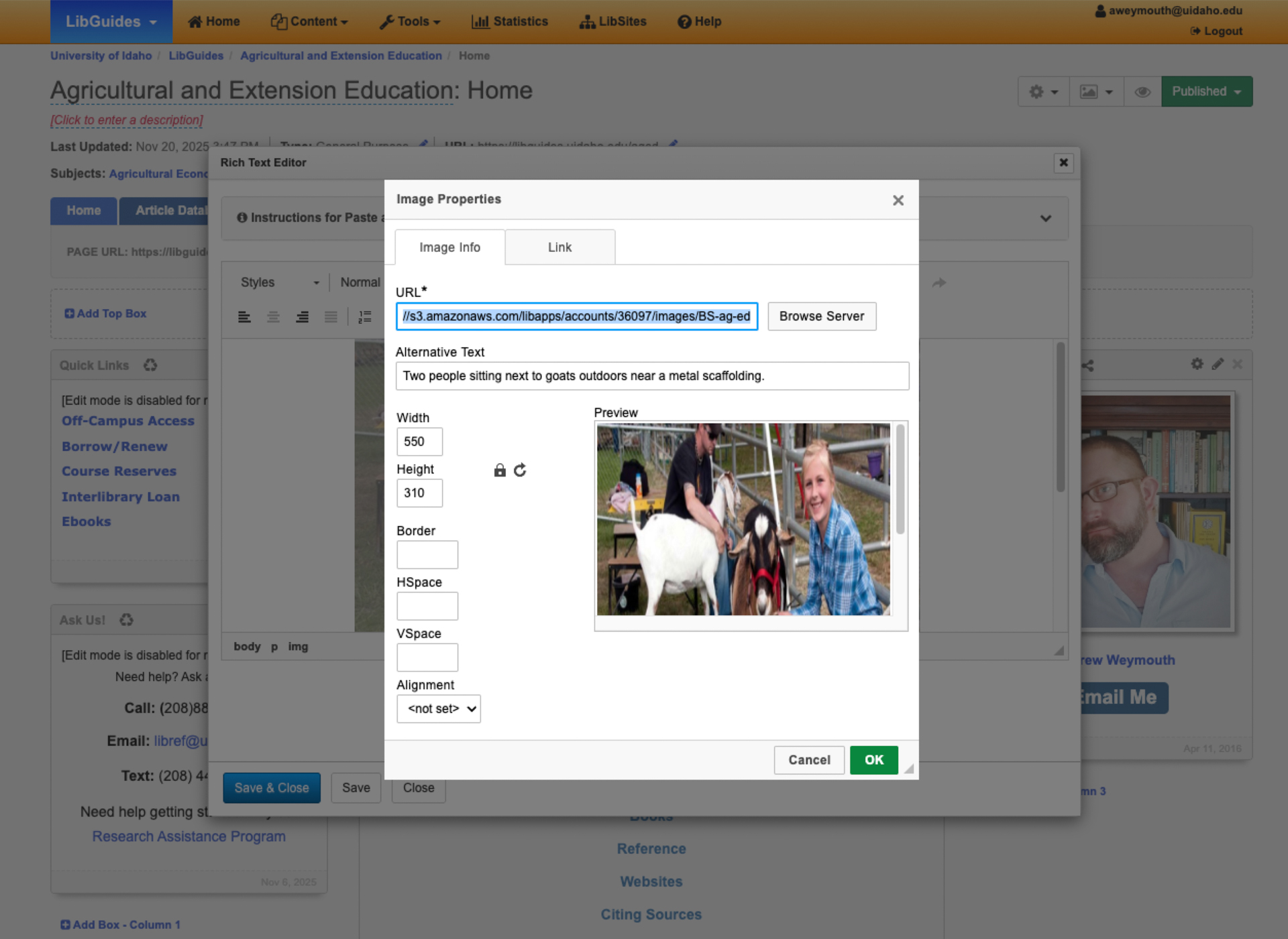 Within the Image Properties window, add or edit descriptions in the Alternative Text field.