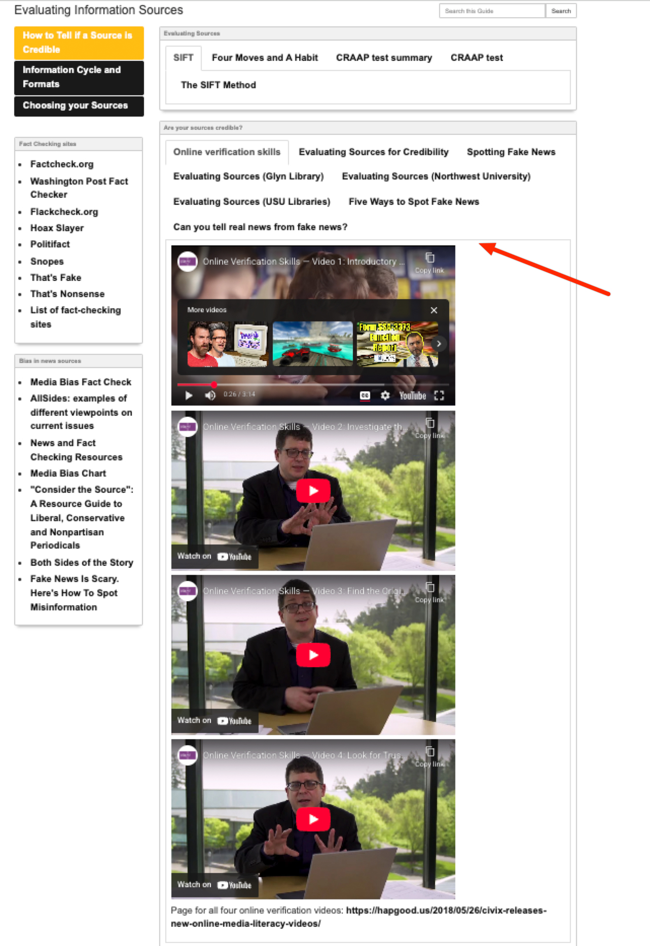 - “Below are four short videos by Mike Caulfield, Director of Blended and Networked Learning, to help you develop your online verifications skills. After the introductory video, the second video will show you how to investigate source materials, followed by how to find the original source of the subject you are investigating, and finally a guide for finding trusted work.”