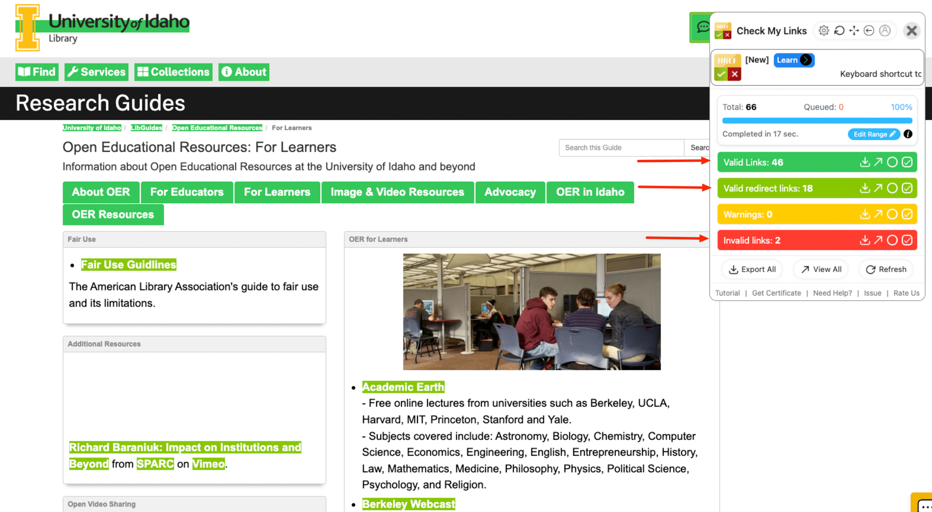 Given the recent redesign of the main University site and changes to government record organization, auditing for bad links (or correctly redirecting links) is important. While there are many options out there, I use one called Check My Links to quickly vet all of the material on a page. Everything you need with the tool can be accessed without the “unlocking features” level of this plug-in.
